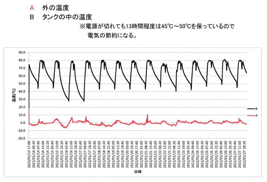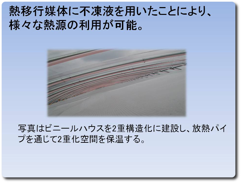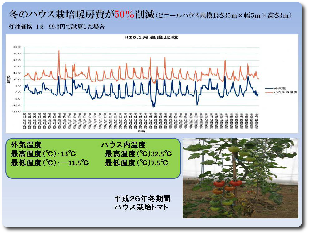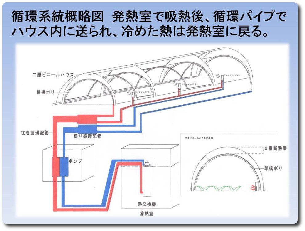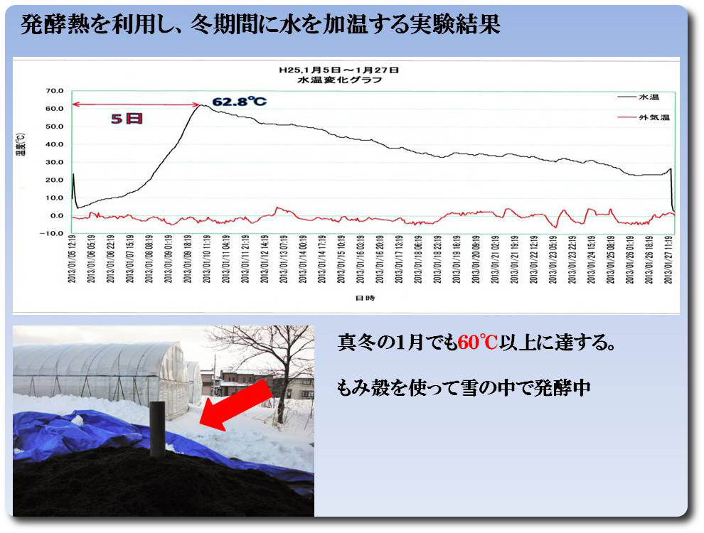 弊社では10年前から実証試験を行い、地中熱も実証試験もして見ましたが、12℃では低いために発酵熱で高めた場合の熱源温度は、60℃ですが、ハウス温度安定為に、発酵熱と電気ヒーターを使用しております。